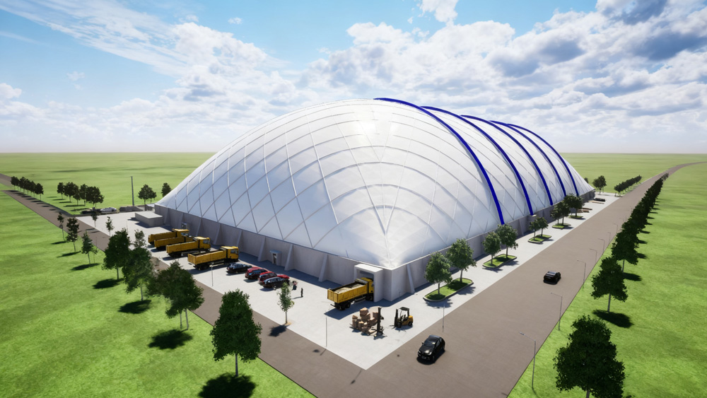 Adopts PVDF coated membrane material and special thermal welding process to form large-span enclosed space without beams and columns, achieving overall support through pressure difference inside and outside membrane (50-100Pa), span can reach over 50 meters.